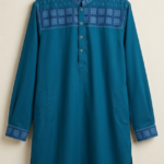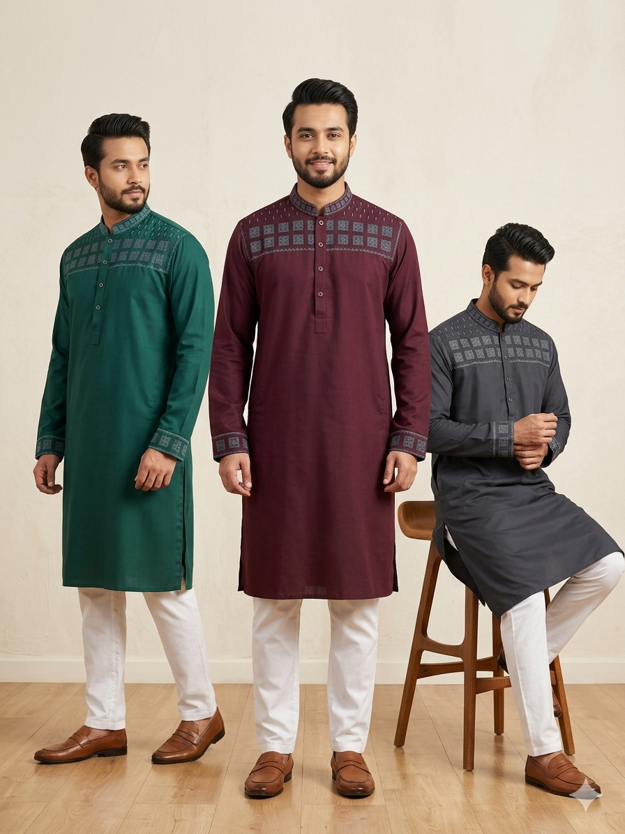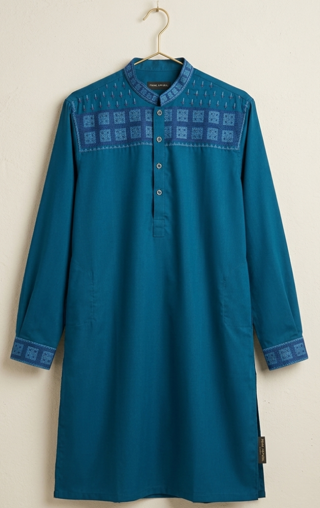 A sophisticated fusion of tradition and modern tailoring. This deep teal Panjabi features precision geometric embroidery on the chest and cuffs, crafted from premium breathable fabric for a sharp, comfortable fit. Perfect for festive occasions and formal gatherings.